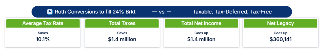This shows a very significant decrease in lifetime taxes, an increase in overall income, and a larger legacy for loved ones (as compared to traditional distribution/income strategies)!